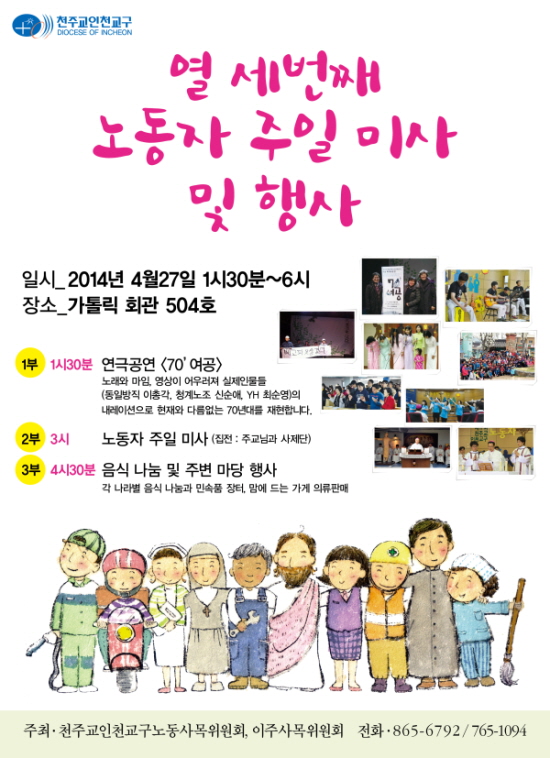 천주교 인천교구가 13번째 노동자주일을 맞아 교구장 담화문을 발표하고 기념미사를 봉헌한다. 기념미사 전후에는 노동자들을 위한 연극 공연과 갖가지 부대행사가 마련된다.