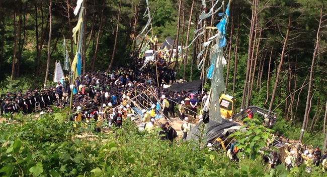 밀양 송전탑 공사를 저지하기 위해 최후까지 남았던 4개 마을 5개 농성장이 11일 모두 사라졌다. 지난해 10월 공사가 재개된 지 8개월 만이다.