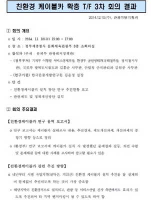 TF 논의 안건은 설악산 케이블카 설치 지원을 위한 ‘환경 검토 기준에 합당하도록 컨설팅 지원(환경부)’, ‘전국 케이블카 실태조사 및 신규 설치 희망지역 지자체 수요 조사’ 등이다. 2차 회의에서는 이에 따라 설악산 오색케이블카를 위한 계획안이 마련됐으며, 인허가 과정에서 문화재청, 산림청 등과 협의할 것을 결정하고, 완공 시기를 2017년 12월로 정했다. 또 2014년 11월 10일 3차 회의에서는 지리산 친환경케이블카 설치에 대해 논의하기도 했다.