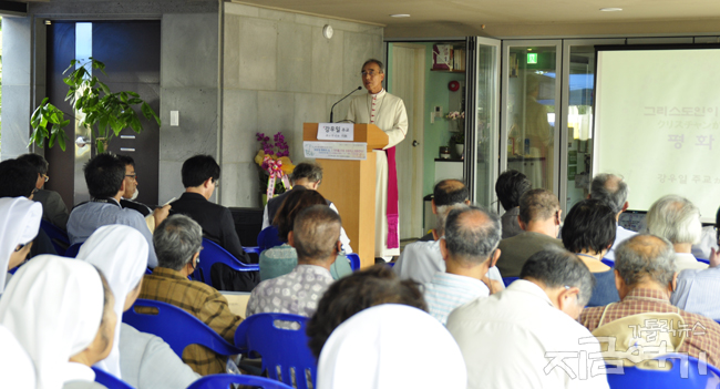 먼저 강우일 주교는 ‘그리스도인이 추구하는 평화’에 대해서 당장 정치적으로 규정된 눈앞의 적을 공격하는 것이 아니라, 그들 역시 우리의 형제이고 자매임을 깨닫는 평화를 추구해야 한다고 역설했다.