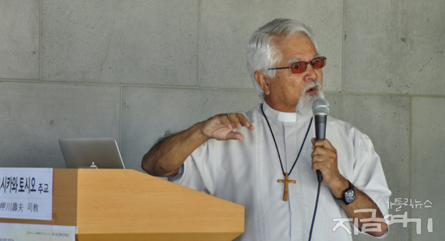 도시오 주교는 오키나와는 미군 기지로 인한 피해와 함께 본토 일본인들의 구조적 차별까지 겪고 있다면서, “오키나와는 여전히 전쟁을 겪고 있다”고 말했다. 또 일본 정부의 평화헌법 9조 무력화 시도와 이를 강행하는 아베 정권에 대해 “역사인식은 물론, 전쟁에 대한 책임의식이 전무하다”며 강도 높게 비판했다.