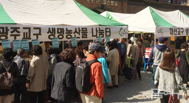 의정부교구 유정란, 마산교구 녹두전, 안동교구의 포도와 소고기, 다양한 나물, 장류, 젓갈 등 각 교구 가톨릭농민회가 생산한 유기농 지역 농산물과 제철 먹을거리가 가득 찬 대성당 앞 마당은 신자들과 나들이 나온 시민들의 발길로 북적였으며, 오후 1시를 넘기면서 국밥과 수육, 현장에서 직접 담근 김치 등은 금세 동났다.