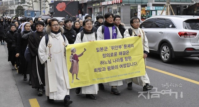 신자들은 미사를 마친 뒤 일본대사관 앞부터 종로구청, 보신각 앞을 지나 ‘한일 위안부 합의 무효 전국 행동의 날’ 행사가 열리는 청계광장까지 말 없이 행진했다. 수원교구 정의평화위원장 최재철 신부, 의정부교구 정의평화위원장 상지종 신부 등 전례복 차림의 사제 4명이 현수막을 들고 앞장섰다.