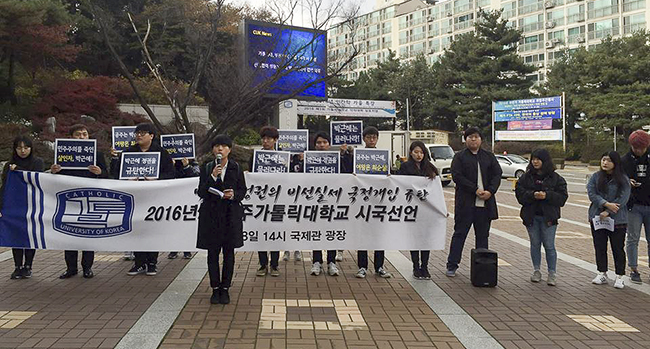 이른바 최순실게이트라는 박근혜 대통령의 국정 문란으로 대학가에 시국선언이 잇따르고 있는 가운데 가톨릭대학교와 서강대 학생들도 각기 시국선언문을 내고 박 대통령의 사퇴와 진상 규명을 요구했다.