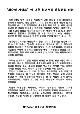 이들은 “최순실이 저지른 온갖 비리와 국정개입, 정유라의 이화여대 입시특혜를 보며 우리는 대학생임을 넘어 국민으로서 분노와 통탄함을 느낀다”고 했다. 또 “박근혜 정권 4년, 우리는 민주주의의 역사를 부정당했고, 자유민주국가의 질서를 잃었으며, 4.19혁명, 6월 민주항쟁의 희생정신을 유린당했다”고 규탄했다.