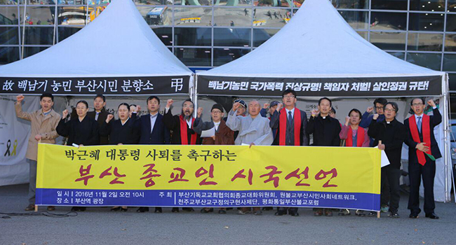 천주교 부산교구 정의구현사제단과 부산기독교교회협의회 종교대화위원회, 원불교 부산시민사회 네트워크, 평화통일부산불교포럼은 11월 2일 부산역 광장에서 기자회견을 열고 시국선언문을 발표했다.