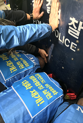2017년 9월 4일, 사드 추가 배치를 앞둔 소성리. 평화로운 마을에 경찰 수천 명이 겹겹이 둘러싸 주민들을 고립시킨 다음, 적폐정권 시절에도 없었던 소위 ‘종교 케어팀’이란 이름의 경찰들이 성직자들을 끌어내고 폭행하고 미사 제구를 탈취했습니다. 11월 6일 트럼프 방한 시기에 맞춰 문규현 신부님과 교무님, 목사님 등 종교인들은 다시 전쟁 반대, 사드 철회의 뜻으로 광화문에서 청와대까지 삼보일배로 평화 순례를 떠났습니다. 트럼프가 광화문을 지나가던 날, 법원에서도 허가한 청와대로 향하던 기도순례를 아무런 이유 없이 경찰들은 막아섰습니다. 문규현 신부님은 순례길이 막히자 그 자리에 엎드려 경찰의 방패를 머리로 밀며 앞으로 나아가려 합니다. 함께 있던 목사님은 우리가 몇 시간 동안 기어온 몇십 센티미터밖에 안 되는 거리가 문재인 정부의 거리라고 울며 소리칩니다.