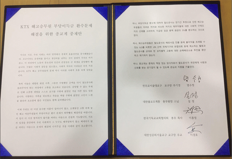 1월 16일 대전지법(조정전담법관 정우정)은 “종교계가 제시한 중재안에 따라 KTX 해고 승무원은 원금의 5퍼센트인 총 1억 4256만 원(1인당 432만 원)을 2018년 3월말까지 철도공사에 지급하고, 철도공사는 나머지 청구를 포기하는 내용의 조정을 권고하겠다”고 밝혔다.