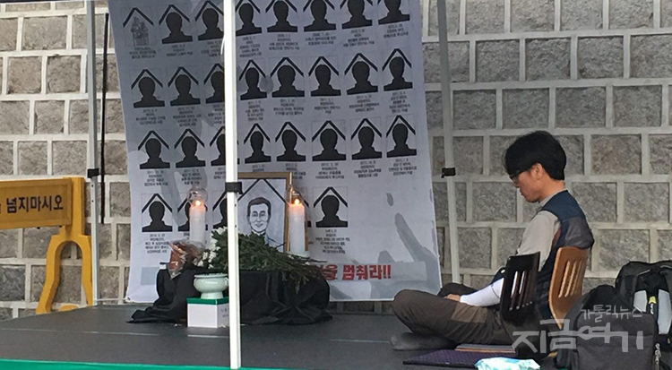 지난 6월 27일 세상을 떠난 고 김주중 씨(47)를 추모하기 위해 7월 3일에 5년 만에 다시 대한문 앞에 분향소가 설치됐다. 해고자인 김 씨는 쌍용차 대량해고 사태가 난 뒤 죽은 30번째 해고자, 관련 가족이다.