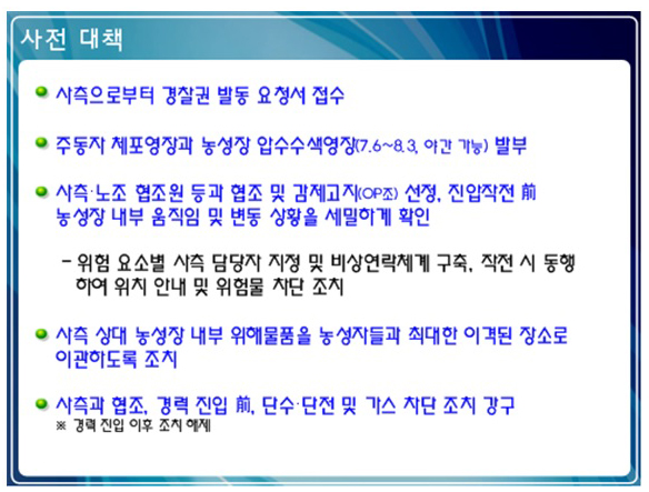 당시 청와대는 강희락 경찰청장과 조현오 경기지방경찰청장 사이의 의견이 엇갈리자, 경찰 병력을 투입하라고 직접 지시했다.