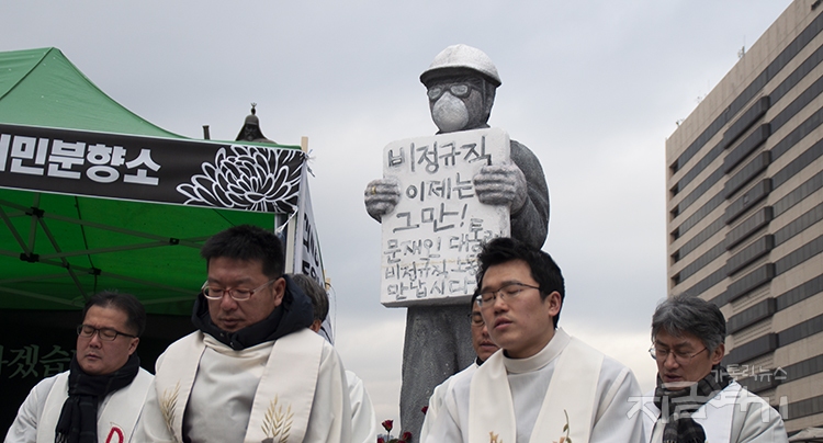 이어 오후 2시에는 서울 광화문에 마련된 고 김용균 씨 시민분향소 앞에서도 300여 명이 참석한 가운데 성탄미사가 봉헌됐다.