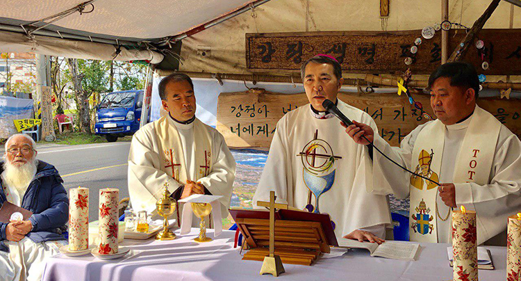 제주 강정마을 거리천막에서도 이날 마을 주민과 제주교구 신자들이 참석한 가운데 성탄미사가 봉헌됐다.
