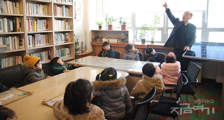 환경사목위원장 백종연 신부는 아이들과 북극곰 이야기를 나누고, 사무실에 있던 태양광 패널을 보여 주며 동요 ‘우리의 친구 북극곰’을 함께 부른 뒤, 기부금을 전달 받았다.