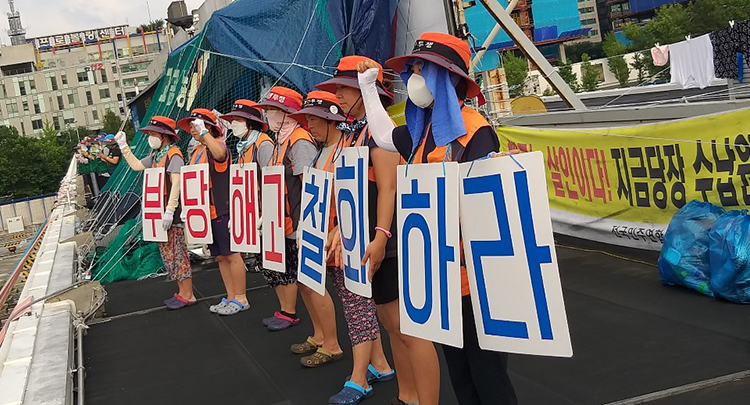 휴가철, 평소보다 더 많은 차량이 오가는 서울요금소 옥상에 평균 나이 50대인 여성 35명이 올라가 있다. 지난 6월 30일 새벽 올라간 이들은 잦은 폭우와 무더위에도 한 달 넘게 그곳에 있다.