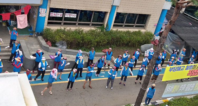 <이명금 지회장> : 오늘 새벽까지 바람도 많이 불고 장대비가 쏟아지다 그치기를 반복하고, 낮부터는 무더위가 시작돼 걱정이다. 더울 때는 여기 온도가 48도까지 올랐다. 우리가 있는 곳이 톨게이트 옥상이라 방수용 고무판이 설치돼 있는데, 고무판이 열을 받으면 발을 대기가 힘들 정도로 무척 뜨겁고 열이 올라온다.