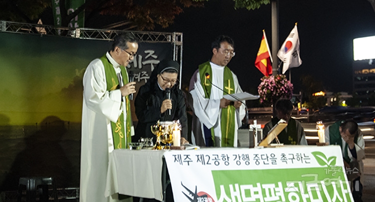 허 신부는 “제주 관광, 경제를 위한다며 제2공항을 짓는다고 하지만 이는 제주에 해군기지에 이어 공군기지까지 만들자고 작정한 것 아닌가”라며 “정부는 남부 탐색구조부대 창설이라는 허황한 군사국가 이상을 버리고 평화를 위해 일해 달라”고 요청했다.