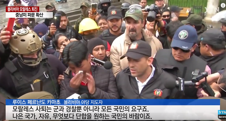 이제 과거 1973년 칠레 피노체트 방식의 쿠데타는 없다. 이제 새로운 방식이 적용된다. 군부가 직접 전면에 나서지 않는다. 루이스 페르난도 카마초가 중심인물이다. 40살의 부유한 극우파 변호사로 볼리비아의 동부 산타 끄루스 출신이다. 이곳은 우파의 아성인 지역이다. 그는 극우 시민단체(El Comite Civico)의 지도자다. 그의 가족은 많은 기업을 거느리고 있다. 멕시코의 유력 매체 <라 호르나나>에 의하면 그는 인종주의자로서 원주민들에 대해 강한 차별과 혐오감을 가지고 있다고 한다. 현재 원주민의 상징 깃발인 위팔라(wiphala)가 불태워지고 있다. 그는 에보 모랄레스에게 사퇴서에 서명을 강요했다가 일단 실패했다. 그는 성경을 들고 다닌다. 볼리비아 시민들에 대한 헤게모니 전략으로 하느님을 강조하는 것으로 보이는데 얼마 전 브라질의 볼소나로만 그런 것이 아니라 과거 스페인의 프랑코도 그랬음이 기억된다.
