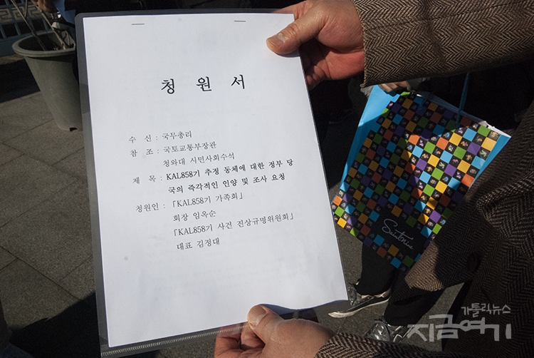 30일 이들은 정부서울청사 앞에서 기자회견을 열고 KAL858기 추정동체 즉각 인양, 조사를 촉구하며 국무총리실과 청와대 시민사회수석실에 청원서를 접수했다.