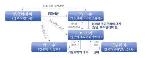 | 마주 | -전국 900여 명. 마사회 등록 말 소유주 -말 훈련, 경기를 조교사에 위탁 -마사회가 정한 기준에 따라 상금을 말 훈련과 경기비용으로 조교사에게 지불함. | 마주 등록, 취소권한은 마사회에 있음. |