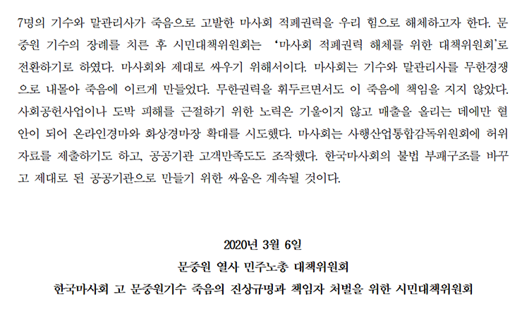 이날 공공운수노조는 부산경남 경마본부장이 고 문중원 기수 시민대책위와 문중원 열사 민주노총 대책위원회가 낸 입장문 가운데 “시민대책위를 마사회 적폐청산 위원회로 전환하기로 했다는 내용을 문제 삼아 공증을 거부했다”고 밝혔다.