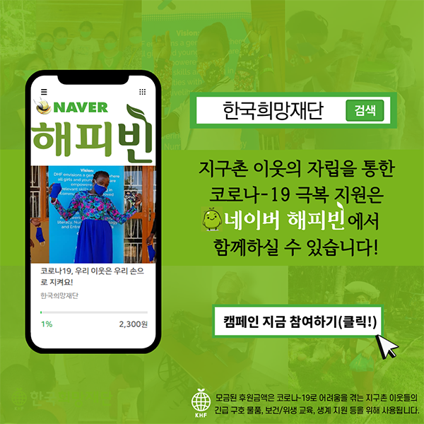 코로나19 바이러스가 자꾸만 장기화되고 있는 지금, 여전히 아시아, 아프리카 곳곳에는 마스크 착용이나 손씻기 등이 일상화되지 않았으며 확진자 현황조차 파악이 잘 되지 않고 있습니다. 이 상황에서 어떤 주민들은 코로나19를 결국은 공동체의 힘으로 극복해 내겠다는 희망을 가지고 있습니다. 그 어느 때보다도 치열한 시간을 보내고 있는 지구촌 이웃들. 하단 해피빈 캠페인 참여를 통해 이들에게 더욱 나은 내일을 선물해 주세요.