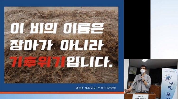 첫 번째 강연자로 나선 황인철 녹색연합 기후에너지팀 팀장은 그린뉴딜 정책의 문제점을 지적하고, 기후위기 관련 정책에 있어 시민이 주체가 되는 풀뿌리 운동의 중요성을 강조했다.