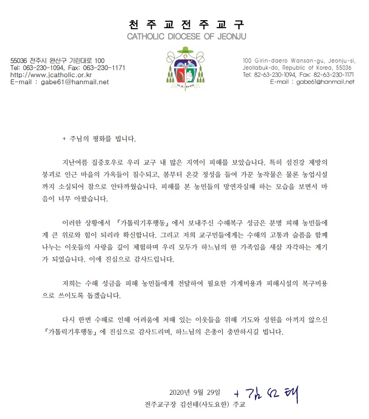 김 신부는 “이번 피해를 위한 일회성 지원이 아닌, 앞으로 계속 겪어야 할 기후 변화에 어떻게 적응하고 대응할 것인가를 위한 지속적 노력의 시작”이라면서, “특별히 피해가 큰 농촌 지역, 또 가톨릭농민회 회원들의 피해 상황 조사를 요청하고 그 결과를 중심으로 모금액을 지원해드렸다”고 말했다.
