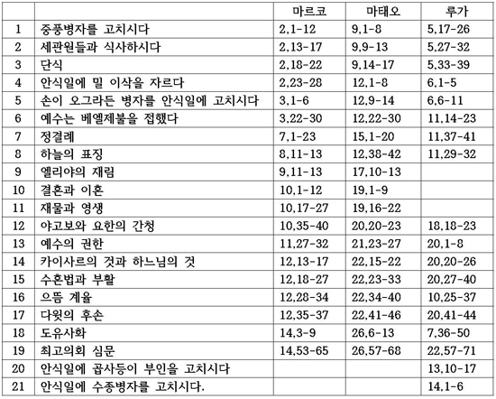 예수께서는 당대 종교지도자들, 특히 바리사이들과 바리사이계 율사들과 논쟁을 벌인다. 그 짜임새로 보면 주제설정, 적수들의 이의제기, 예수의 반론으로 되어 있다. 항상 예수께서 적수들을 이긴다. 논쟁사화는 늘 예수의 결론으로 마무리된다. 논쟁사화는 종종 기적사화 양식과 겹친다(1․5․19․20). 예수께서 기적을 행하시는 가운데 논쟁이 벌어지는 것이다. 논쟁사화와 흡사한 게 대담사화다. 다른 점이라면 대화상대가 이의를 제기하지 않고 예수께 무엇을 간청하거나(12) 가르침을 받으려고 한다(11․16). 적의가 보이지 않는 게 논쟁사화와 다른 점이라 하겠다. 독일 성서학계에선 대담사화 대신 사제간의 대담이라고 한다. 요한복음에도 논쟁사화와 대담사화가 제법 나오지만 공관복음서에 비해 신학적 성찰을 많이 담고 있어 여기서는 다루지 않는다.