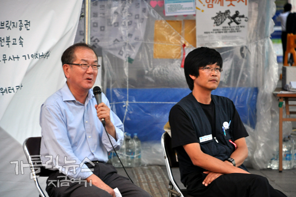 6월 15일 오후 7시, 대한문 앞에서 정리해고에 맞서 오랜 시간 싸우고 있는 노동자들의 현실을 알리기 위한 거리 강연 ‘시대를 묻다: 톡톡톡(Talk Talk Talk)’ 두 번째 마당이 열렸다. 이날에는 홍세화 대표와 홍종인 금속노조 유성기업 지회장이 강연자로 나서 시민들과 이야기 나눴다.