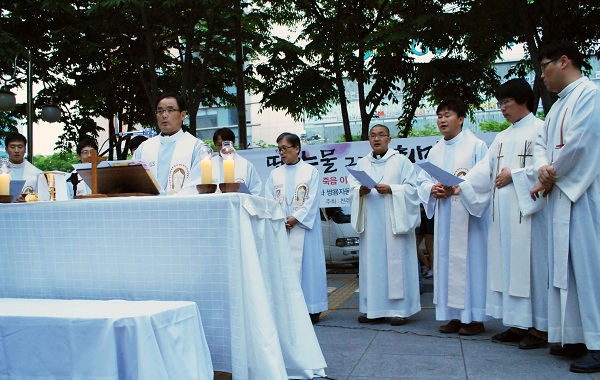 다행히 대구 정평위는 작년부터 매달 노동 미사를 이어오고 있다. 올해 들어 투쟁하는 노동조합과 함께하는 미사를 드리고, 지난 5월 노동절을 맞아 대구대교구는 교구 설정 100년 만에 처음으로 노동자를 위한 거리 미사를 봉헌했다. 첫 거리 미사이고, 더구나 민감한 노동 미사를 준비하면서 가장 큰 우려는 과연 얼마나 많은 항의 전화가 있을까 하는 것과 몇 명의 사제가 함께할까 하는 것이었다. 참석하기로 한 정평위원 신부들이 하필이면 이날 또 그리 일이 많았던지……. 하지만 2·28공원에서 봉헌한 이날 미사에는 놀랍게도 일부러 맞춘 듯이 사제 12명이 참여하였고 200명 가까운 신자들과 노동자들이 함께했다.