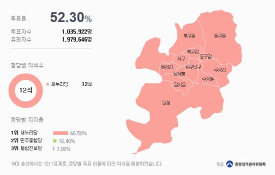 대한민국은 세 개의 나라로 이루어져 있다고 말하면 이해가 될까? 남과 북, 그리고 대구. 다른 지역에 사는 사람들은 대구가 ‘이상한 나라’로 인식되어 도무지 이해되지 않는 모양이다. 지난 4·11 총선에서도 대구는 한 치의 흐트러짐 없이 새누리당을 당당하게 지지했다. 빨강색을 그렇게 싫어하다가도 새누리당이 빨강색을 입으면 그저 좋아한다. 애초 색깔에 대한 호불호는 없었던 셈이다.