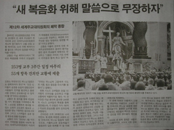 ‘주교시노드’라 일컫는 세계주교대의원 제12차 정기회의가 지난 10월 5일 바티칸에서 개막하여 10월 26일 폐막하였다. 교황 베네딕토 16세는 개폐막 미사를 통해 “이번 시노드가 사람들에게 어떻게 하느님 말씀을 효과적으로 전달할 수 있을 지 고민하고 인간 삶의 중심에 놓여 져야 한다는 것을 알리는 시간이 될 것이며, 모든 신자들이 성경을 손쉽게 접함으로써 사람들이 진리를 발견하고 참된 사랑 안에서 성숙해 나갈 수 있어야 할 것”이라고 했다.