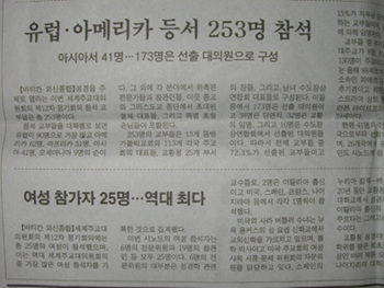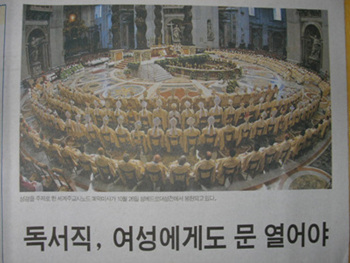 3주전 애당초 교계신문이 제12차 주교시노드에 대한 특색으로 강조하였던 것 중 하나는 놀랍게도(?) 여성의 사상 최다 참가라는 점이었다. 10월 12일자에 <가톨릭신문>은 ‘여성 참가자 25명 역대 최다’라는 기사를 실었으며(8면), <평화신문>은 ‘여성에게 열린 세계 주교시노드’라는 제목을 뽑았었다(7면). 사실 시노드에 참가한 여성 25명의 구성을 보면 각국의 주교 참석자를 제외한 41명의 전문위원 중 여성은 6명이고, 37명의 참관인중 19명이 여성인 점을 비추어 보면 언론이 주목하기에는 적지 않은 숫자이기도 했다. 그러나 우리나라의 여성참가자는 없었으며 전주교구장 이병호주교가 한국대표로 참가했고 한홍순 한국평협회장이 참관인 자격으로 참석했을 뿐이다.