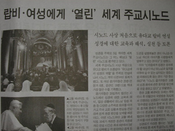 그러니까 애초 교계신문들이 이번 시노드의 특색중 하나로 보도한 “여성 최다 참가”라는 말은 남의 나라 일이었다. 우리에게는 하등 해당이 없는 말이기도 했다. 우리나라 교계의 여성 성서신학자들이 ‘성경’을 주제로 한 시노드에 전문위원이나 참관인으로 왜 참석을 못한 것인지 혹은 안한 것인지는 한번 살펴봤어야 했다. 또한 그렇게 주목하던 여성 최다 참가가 시노드의 결정에 어떤 영향을 미칠 수 있었던 것인지는 폐막을 앞두고 보도했어야 일의 앞뒤가 맞물려 돌아가는 것이다. 여성이 25명 아니라 250명이 참가한들 그것이 시노드에 아무런 영향을 미치지 못했다면 애당초 참가의 의미는 없는 것이다. 전시행사란 그런 것 아닌가? 그러나 이번에는 여성과 관련된 의미 있는 결정이 하나 나왔다. 그렇다면 언론으로서는 ‘이보다 더 행복할 수는 없는 것’이다. 그러나...