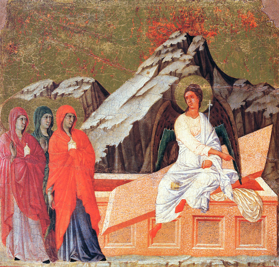 마태오 복음서에는 이야기가 다르다. 무덤에 간 여인의 수는 2명이고 향료에 대해서는 말이 없다. 그들은 묘소를 보러 갔다. 큰 지진이 일어나고 “주님의 천사가 하늘에서 내려오더니 다가가서 그 돌을 굴러낸다.” 천사의 모습은 “번개 같고 옷은 눈같이 희었다.” “여자들은 겁이 나면서도 크게 기뻐하며 무덤에서 부리나케 나와, 제자들에게 알리려 달려갔다”(28,1-8). 실제로 그들이 알렸는지 혹은 알리지 않았는지는 말하지 않는다.