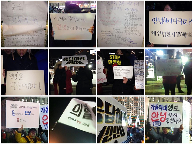 “안녕들하십니까”라는 인사말에 그토록 많은 사연과 안타까움과 기대가 담겨 있었는지, 몇 주 전까지만 해도 실감하지 못했습니다. 한 대학생이 자신의 학교 후문에 손으로 써서 붙인 대자보에 손으로 쓴 답글 쪽지들이 붙고, 역시 손으로 쓴 답글 대자보로 이어져 다른 대학으로, 거리로, 고등학교로, 세대를 넘나들며 퍼져나가고 있습니다. 손 글씨 대자보는 문자와 사진으로 재생산되어 트위터, 페이스북을 통해, 저와 같이 멀리 해외에 살고 있는 이들에게도 날아옵니다. 대자보를 읽은 사람들은 또 대학가로, 광장으로, 공원으로 모여들어 얼굴을 마주 보며 목소리를 모읍니다. 아날로그 방식과 디지털 방식을 결합하여, 우리는 오늘 서로에게 안부를 묻고 있습니다. “안녕들하십니까?”