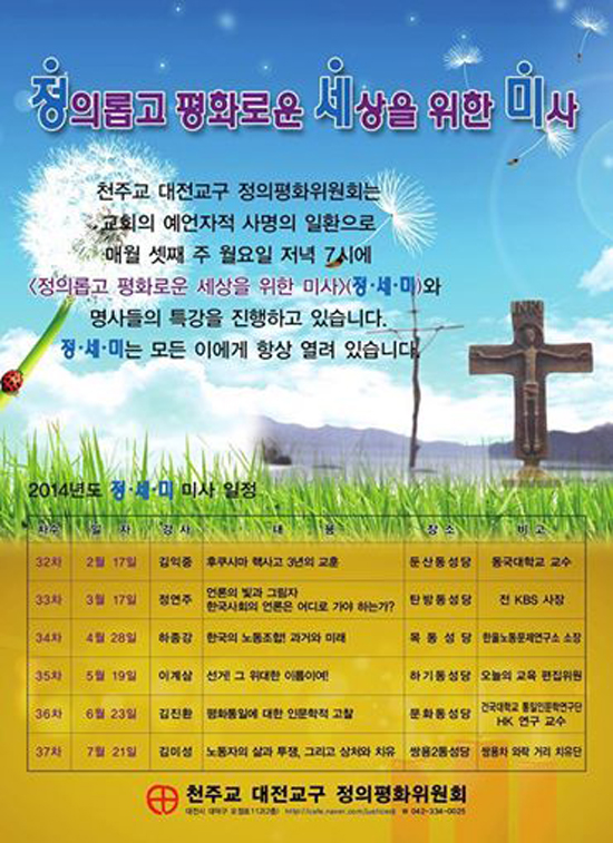 천주교 대전교구 정의평화위원회(위원장 박상병 신부)가 올해에도 ‘정의롭고 평화로운 세상을 위한 미사’(이하 정세미)를 이어간다.