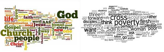 크리스 워커는 프란치스코 교황의 취임 후 104개의 공식 연설과 베네딕토 16세 교황의 취임 후 102개의 공식 연설을 분석했다. 프란치스코 교황이 상대적으로 더 많이 사용한 단어는 ‘가난’(poverty)이다. 이어서 ‘십자가’, ‘성인’, ‘셋’, ‘원하다’, ‘생각하다’, ‘앞으로’, ‘하게 하다’, ‘살’, ‘여성’, ‘여인’, ‘가난한’, ‘제발’, ‘용기’, ‘가다’ 등의 단어들이 뒤를 이었다.