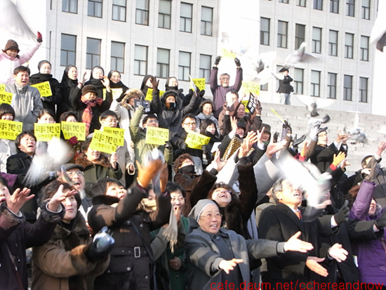 이들은 사형폐지국가 선언문을 낭독한 뒤 현재 수감중인 사형수 64명을 상징하는 비둘기 64마리를 날려 보내는 퍼포먼스를 벌였다.