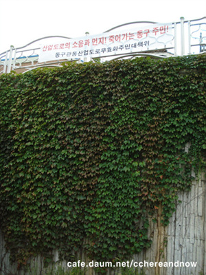 그 옆 벽에는 대책위가 내건 현수막들이 있고, 담쟁이가 벽을 덮고 있다.