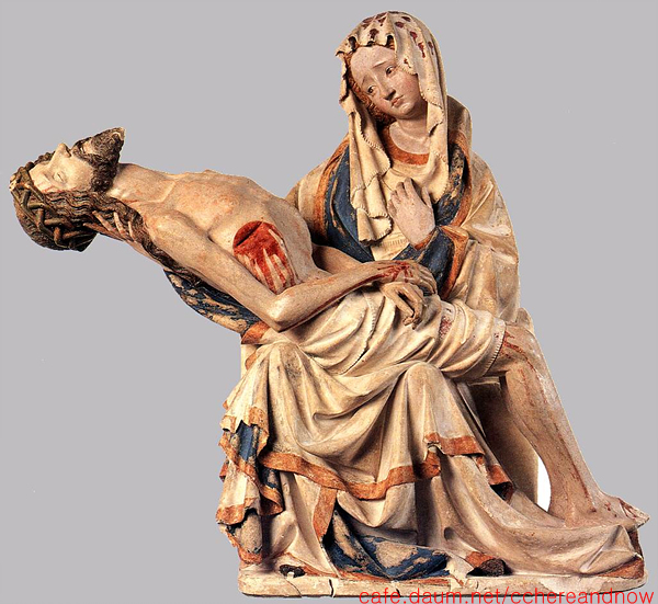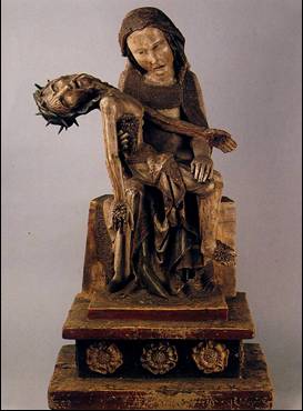 초기 피에타의 표현은 다색의 나무 조각의 형태로 발견되는데 그리스도의 육체적인 고통과 그녀의 죽은 아들에 대한 비통함을 강조한다.<그림1>
