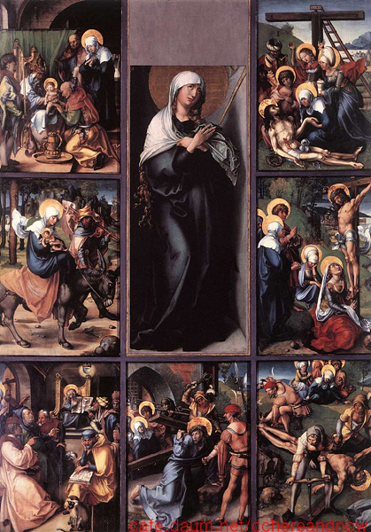 이것은 마리아의 7가지 고통(성모 칠고七苦)<그림 13>에 대한 주제와 기존의 피에타가 혼합된 형태로 보인다. 뒤러의 그림으로 알려진 성모의 7가지 고통의 테마는 가운데 마리아가 왼쪽에서 검의 위협을 느끼면서 손을 포개고 있다. 마리아 주변에는 그녀의 고통을 가리키는 7가지 내용들이 있다.