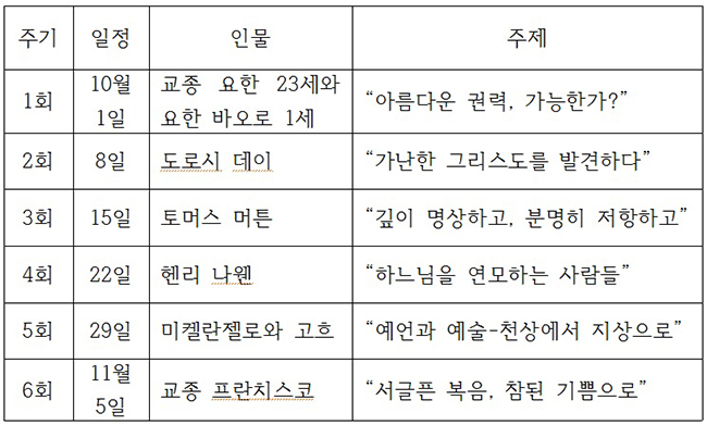 이 강좌는 교회 안에서 오피니언 리더로 활동하고 있는 분들을 초대해 연중 매주 수요일에 진행할 예정입니다. 일상에서 사제와 수도자, 평신도 신학자들과 만날 수 있는 좋은 기회를 놓치지 않으시기 바랍니다. 오는 10월에 시작되는 첫 강좌는 <가톨릭뉴스 지금여기> 주필이며, <행동하는 교황 파파 프란치스코>의 저자인 한상봉 주필이 6주 동안 맡아 주십니다.