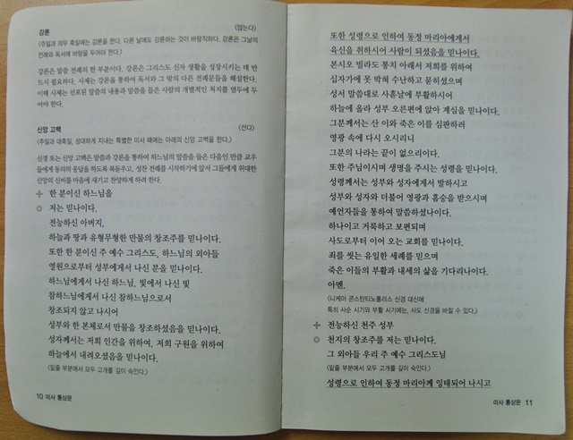 미사경본에 실린 두 가지 신앙 고백문은 내용상 크게 다를 바가 없습니다만 일단 시각적으로 니케아 콘스탄티노플 신경보다는 사도 신경이 짧습니다.