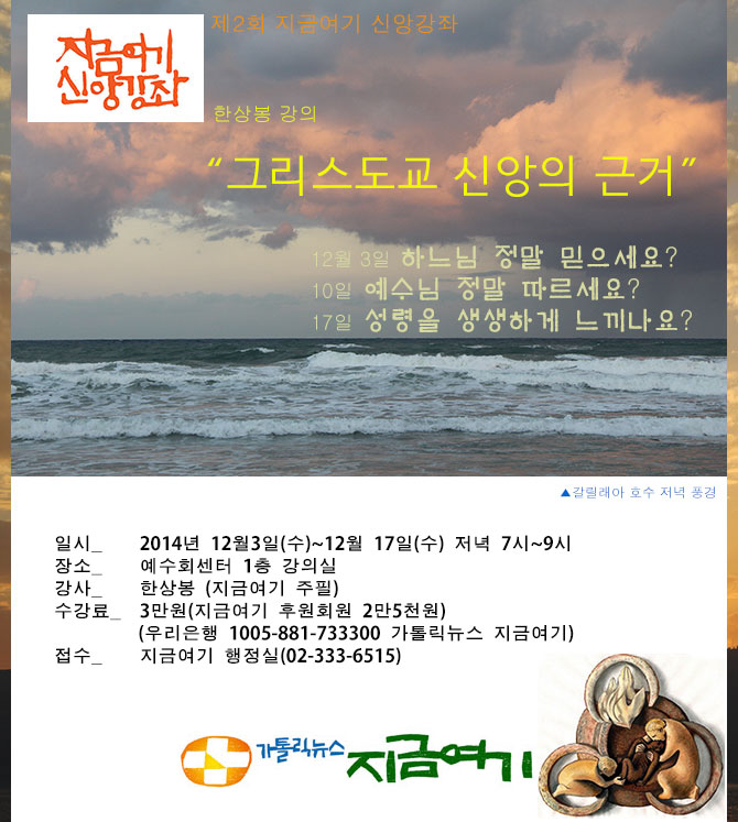 <가톨릭뉴스 지금여기>에서 두 번째 ‘지금여기 신앙강좌’를 준비했습니다. 이번 강좌는 ‘그리스도교 신앙의 근거’라는 주제로 한상봉 지금여기 주필이 다시 맡았습니다. 오는 12월 3일부터 성서를 바탕으로 세 차례에 걸쳐 하느님과 예수님과 성령에 대한 생생한 접근을 시도해 보려고 합니다.