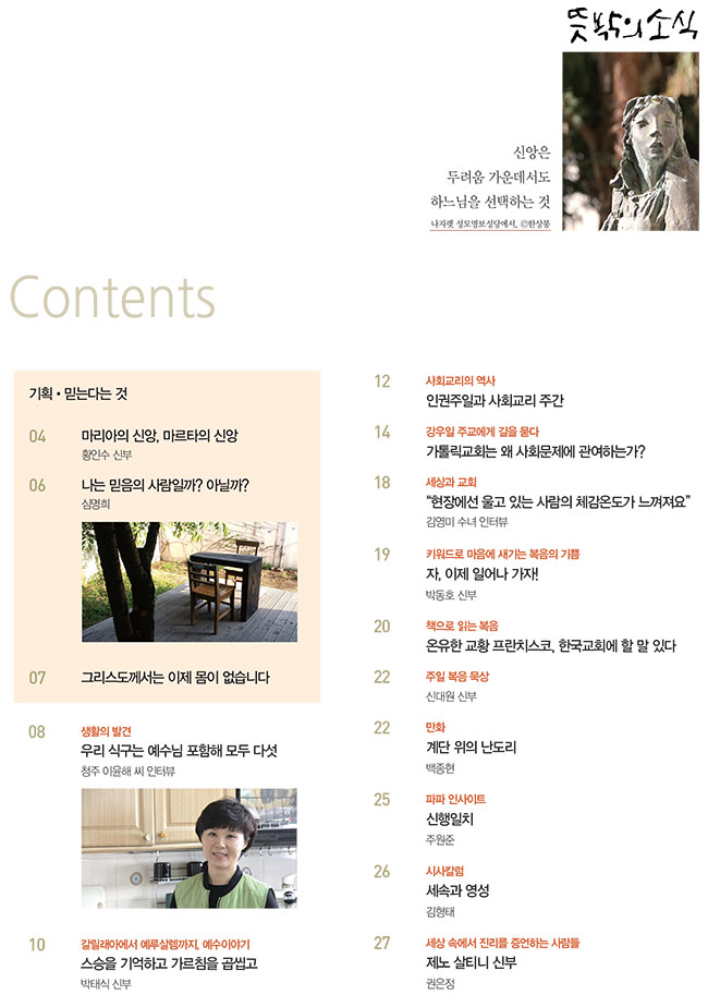 <뜻밖의 소식> 편집 실무는 편집장 한상봉, 편집기자 이희연, 독자관리 김미애가 맡고 있으며, 편집위원으로 김성수 신부(의정부교구 문화미디어국장), 박동호 신부(서울대교구 정의평화위원회), 방영미(웹디자이너), 이미영(우리신학연구소), 황인수 신부(성바오로수도회)가 동반합니다.