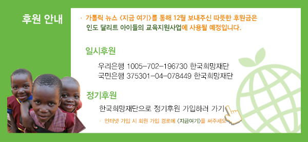 | 국제 개발협력단체인 ‘한국희망재단’과 <가톨릭뉴스 지금여기>는 가난하고 소외된 지구촌 이웃들에게 따뜻한 나눔을 실천하는 공동캠페인을 2014년 한 해 동안 진행합니다. 세계 인권선언일이 있는 12월에는 수천 년을 내려온 카스트 제도로 인해 인권을 짓밟히고 있는 인도 달리트 이야기를 소개합니다. -편집자 |