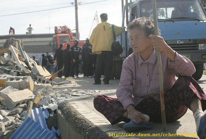 평생살아온 대추리에서 절대 쫓겨날수 없다며 경찰과 철거용역들을 가로막던 할머니