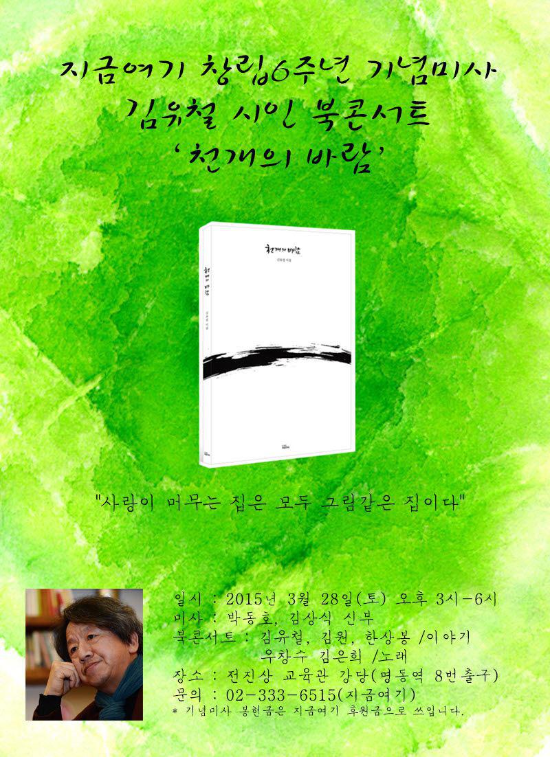 이번 콘서트에 참석하셔서 무엇이 기쁘고 무엇이 슬픈지 김 시인에게 직접 들어보면 어떨까, 생각합니다. 이날 이야기 손님으로는 김원(문화평론가)와 한상봉(지금여기 주필)이 참여하고, 초대가수로 우창수, 김은희 님이 오셔서 축하의 노래도 불러 드릴 것입니다.