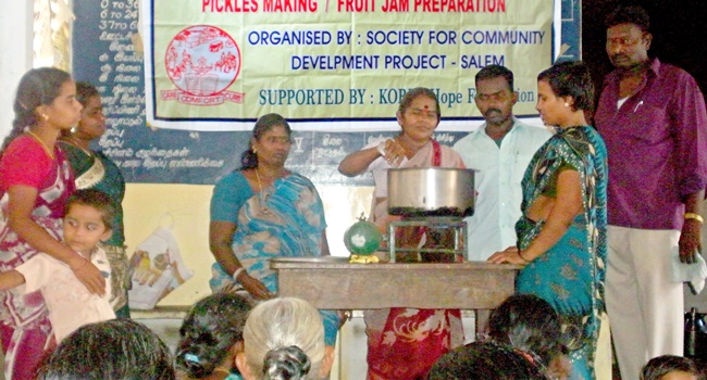 캄캄한 절망만 있던 이들 여성들에게 희망이 찾아온 건 국경 너머 한국희망재단과 인도 현지 협력단체인 SCDP(Society for Community Development Project)가 함께 추진한 ‘식품가공훈련’ 덕분이었습니다. SCDP는 예르카드 부족민 협회 대표들과 함께 마을 여성들 중 가정환경이 어려운 여성 50명을 선발했습니다. 사업이 공고된 뒤 마을의 지원자가 너무 많았기 때문에 합격한 여성들은 기쁨을 감추지 못했습니다. 50명의 여성들은 피클 교육반과 과일잼 교육반으로 각 25명씩 나누어 3달간 교육을 받았습니다.